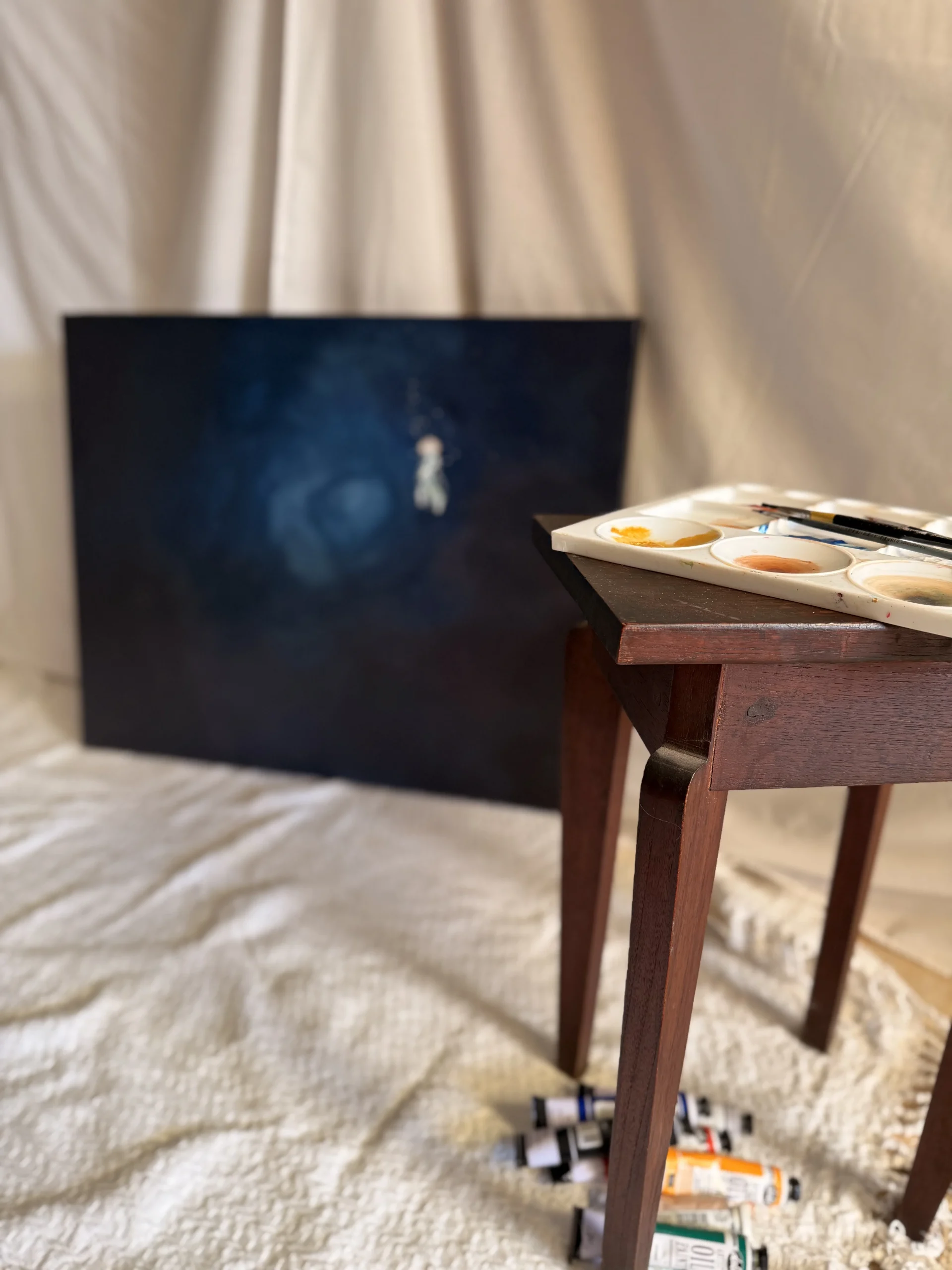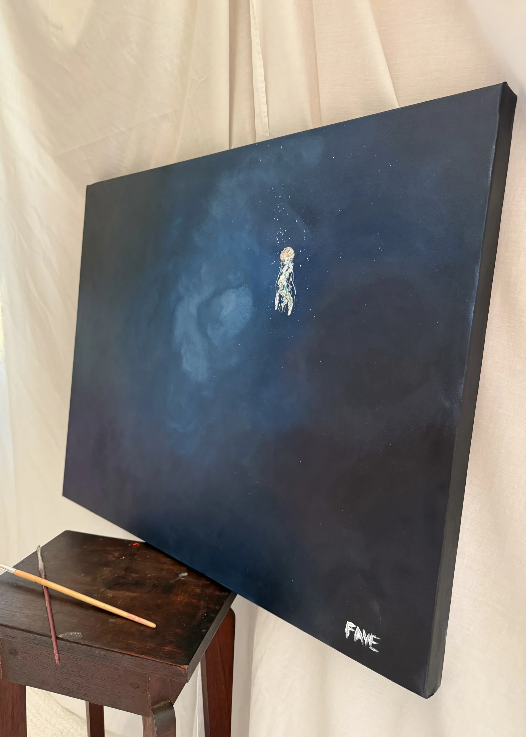 Drifting quietly in a vast indeterminate space. Small in the infinite is inspired by the overwhelming parallels between the ocean’s depth and the cosmos above, this work invites contemplation of our place in the universe and the humbling realization of how small we are against the endless unknown.